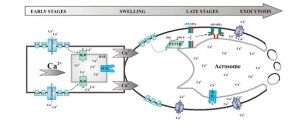 El espermatozoide humano es una célula terminal, muy polarizada cuya única función es transferir el material genético al ovocito. Para que esto ocurra debe secretar el contenido de su gránulo apical denominado acrosoma. Este proceso se denomina exocitosis o reacción acrosomal, tiene un mecanismo complejo que involucra la apertura de múltiples poros de fusión y está altamente regulado.