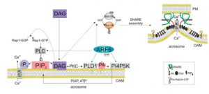Diacilglicerol (DAG) promueve la exocitosis acrosomal en espermatozoides humanos permeabilizados induciendo un ciclo de retroalimentación positiva, dependiente de la activación de PKC y PLD1, que provee fosfatidilinositol 4,5-bifosfato (PIP2) continuamente durante el proceso exocítico. El PIP2 producido es necesario para incrementar la síntesis de inositol-1,4,5-trifosfato (IP3) y promover la salida de calcio del reservorio acrosomal. ARF6 regula el recambio fosfolípidico durante la reacción acrosomal, particularmente las concentraciones de PIP2 y ácido fosfatídico. Ambos lípidos son necesarios para la exocitosis y afectan la curvatura de membrana durante el proceso.