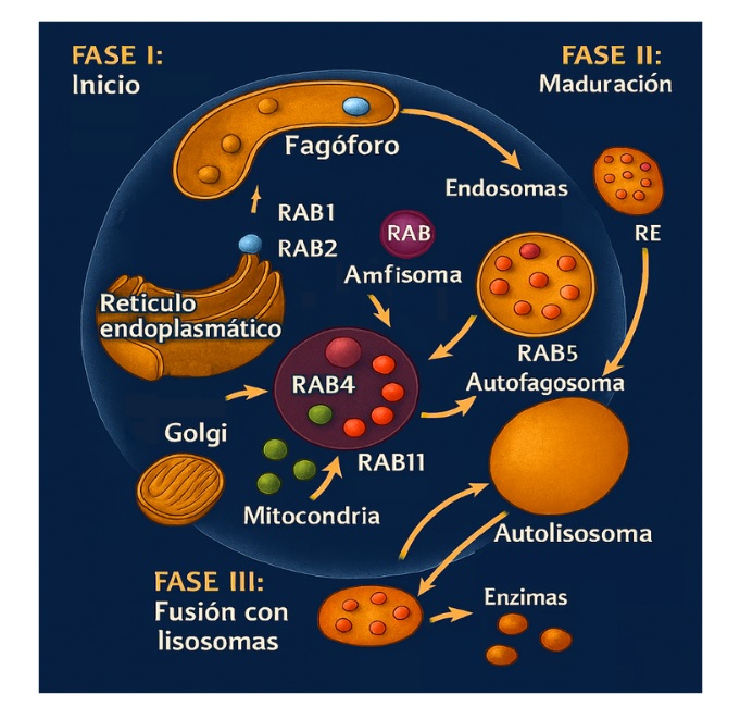 El artículo detalla cómo diferentes RAB GTPasas participan en cada etapa de este proceso: desde el reclutamiento de membranas y la motilidad de vesículas, hasta la fusión de compartimentos y el reciclaje de componentes. Estas proteínas funcionan como verdaderos “interruptores” que controlan el tráfico vesicular, asegurando que la autofagia ocurra de forma eficiente y se adapte a las condiciones del entorno celular, como cambios nutricionales o situaciones de estrés.