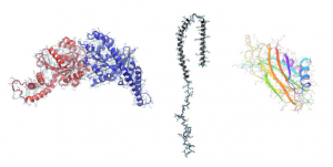 Dímero de dinamina (izquierda), Alfasinucleína (centro) y Sinaptotagmina1-C2B (derecha). Extraído de: Computational Methods for Biological Problems: Membrane Proteins Promenades. Diego Masone. Revista Argentina de Bioingeniería 25 (1), 3-15, (2021).